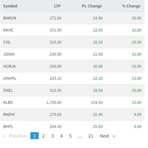 वरुण हाईड्रोपावर, खानी खोला, छ्याङदी, जोशी हाईड्रोपावर, हिमालयन उर्जा, युनियन हाईड्रोपावर, सिंगटी हाईड्रोपावर, अप्तड हाईड्रोपावर, रादी विधुत्, र वराही हाईड्रोपावरको शेयरमा सकारात्मक सर्किट लागेको छ ।
