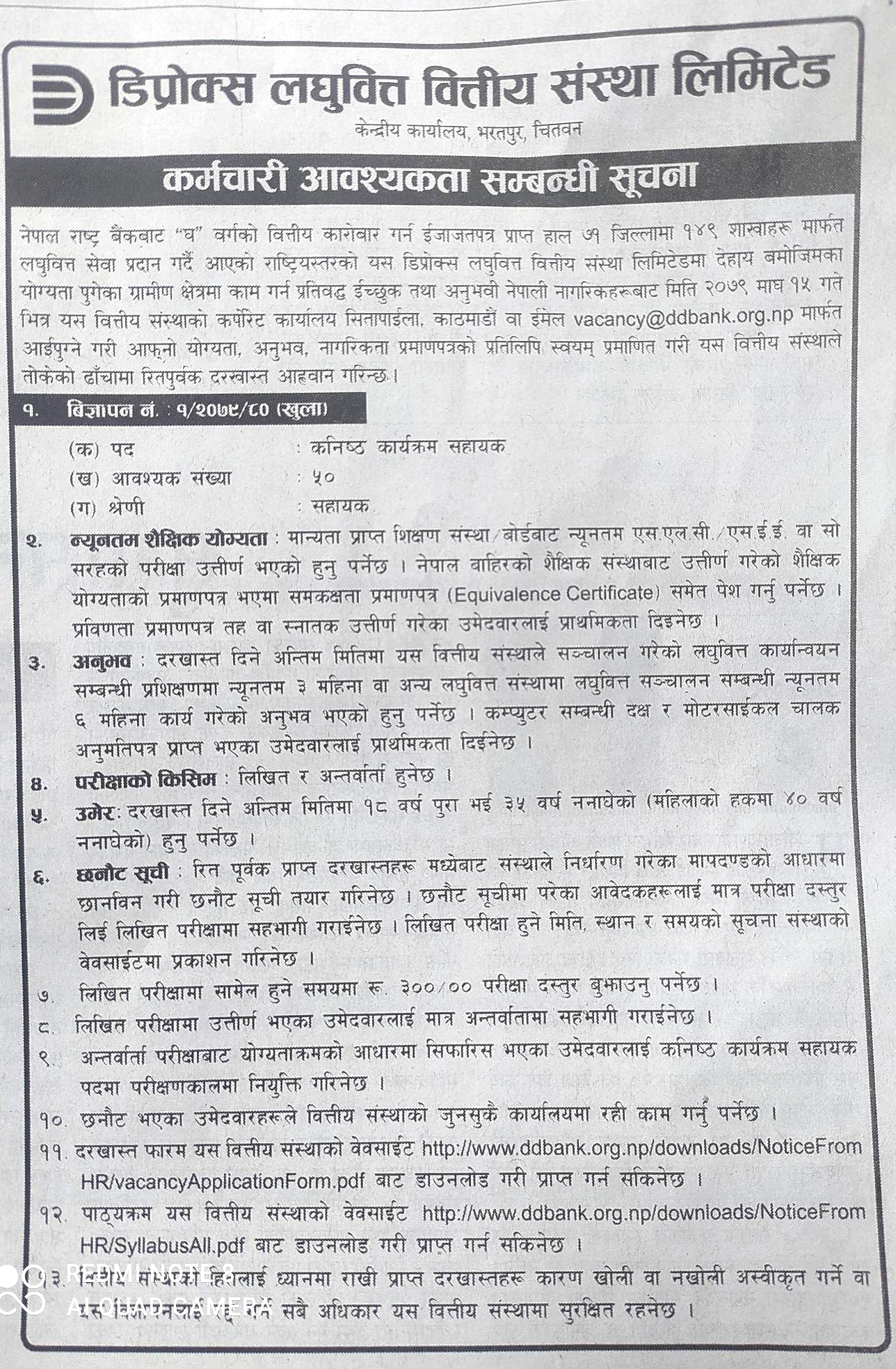 डिप्रोक्स लघुवित्तद्धारा कर्मचारी माग, एसएलसी उत्तिर्णलाई समेत अवसर