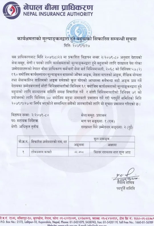 मंसिर २३ गते कार्यक्षमताको मूल्याङ्कनका आधारमा काफलोलाई प्राधिकरणले सहायक निर्देशक पदमा बढुवा सिफरिस गरेको हो ।