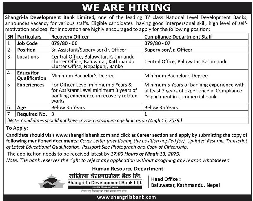 इच्छुक उम्मेदवारले बैंकको वेवसाईट   https://www.shangrilabank.com/   मार्फत आवेदन दिन सक्नेछन् ।