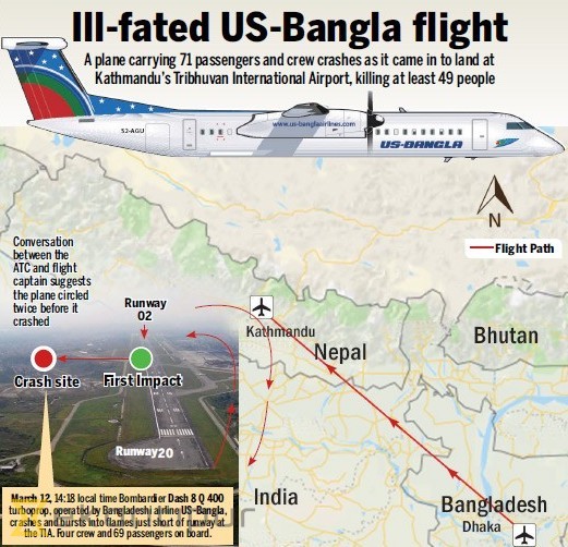 काठमाडौं । २०७४ फागुन २८ गते अपरान्ह बंगलादेशको राजधानी ढाकाबाट काठमाडौं आउँदै गरेको युएस बंगला एयरलाइन्सको जहाजले काठमाडौंस्थित धावनमार्गमै गम्भिर दुर्घटनामा पर्यो । ०२ मा टच डाउन गर्नुपर्ने जहाज २० धावनमार्ग खोज्दै कहिले भक्तपुर त कहिले काठमाडौंमा फन्को मारी रह्यो । त्रिभुवन अन्तर्राष्ट्रिय विमानस्थलका एयर ट्राफिक कन्ट्रोलर अलिकति मात्रै ध्यान दिएको भए युएस बंगलाको उक्त जहाज सजिलै अवतरण गराउन सकिन्थ्यो । अन्ततः फागुन २८ नेपालको हवाई इतिहासमा कालोदिन सावित बनेको थियो ।
