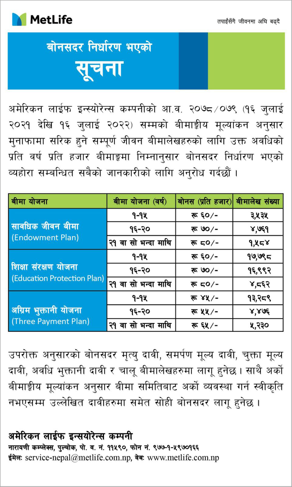 मेट लाइफ इन्स्योरेन्सको नयाँ बोनसदर सार्वजनिक, अधिकतम ८० रुपैयाँसम्म बोनसदर निर्धारण