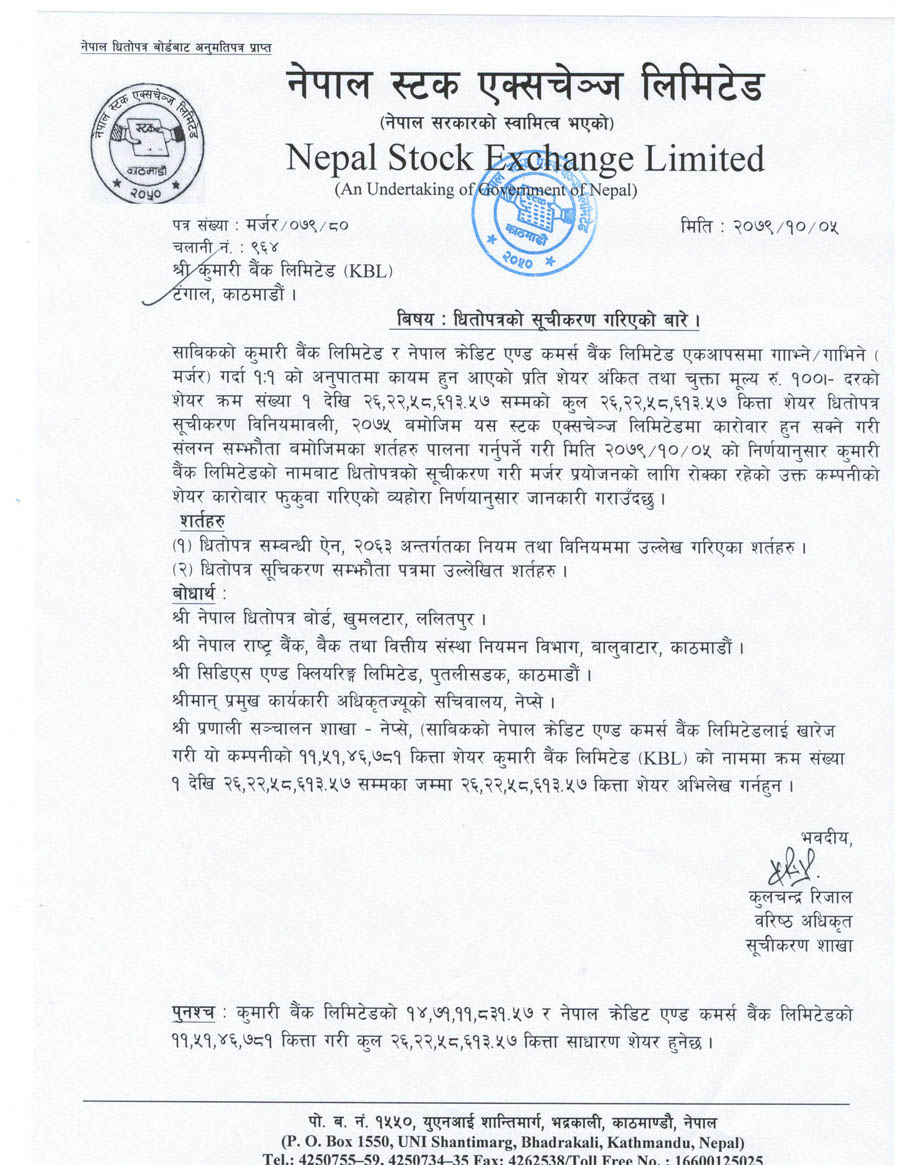 एकआपसमा गाभिएपश्चात् समायोजित भई कुमारी बैंकको नाामबाट १०० रुपैयाँ दरको कुल २६ करोड २२ लाख ५८ हजार ६१३ कित्ता शेयर सूचीकृत भएको हो । सूचीकृतपश्चात् अब मर्जर प्रयोजनका लागि रोक्का रहेको उक्त कम्पनीको शेयर कारोबार फुकुवा गरिएको समेत नेप्सेले जनाएको छ ।
