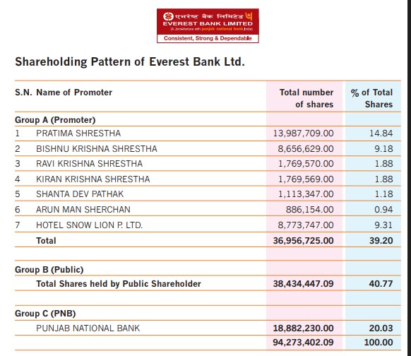 काठमाडौं । एभरेष्ट बैंक लिमिटेडले आफ्नो शेयर संरचना ३ तहमा विभाजन गरेको छ । बैकका संस्थापक शेयरधनीहरुको ३९ दशमलव २० प्रतिशत शेयर स्वामित्व रहेको छ । त्यस्तै, सर्वसाधारण समुहका शेयरधनीहरुको ४० दशमलव ७७ प्रतिशत शेयर स्वामित्व रहेको छ भने वैदेशिक लगानी गर्ने संस्था पन्जाव नेशलन बैंकको २० दशमलव ३ प्रतिशत शेयर स्वामित्व रहेको छ । मा