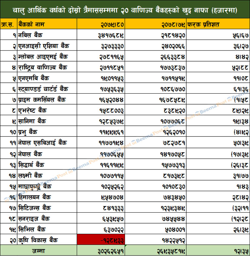 त्यस्तै, नबिल बैंकले ५६.६७ प्रतिशतले नाफा बढाएको छ भने राष्ट्रिय वाणिज्य बैंकले ५२.८८ प्रतिशत, नेपाल एसबिआइ बैंकले ५०.३५ प्रतिशत, एनआइसी एशिया बैंकले ३६.२७ प्रतिशत, लक्ष्मी बैंकले ३१.७७ प्रतिशत, हिमालयन बैंकले २८.४२ प्रतिशत, सिभिल बैंकले २६.३५ प्रतिशत, सानिमा बैंकले १९.३४ प्रतिशत, एनएमबि बैंकले ११.०८ प्रतिशत, ग्लोबल आइएमई बैंकले ४.४२ प्रतिशत र माछापुच्छ्रे बैंकले १.४३ प्रतिशत बढीले नाफा बढाएको छ ।