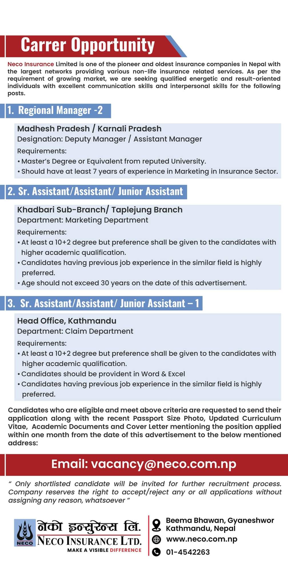 नेको इन्स्योरेन्सद्धारा कर्मचारी माग, कति चाहिन्छ शैक्षिक योग्यता ?