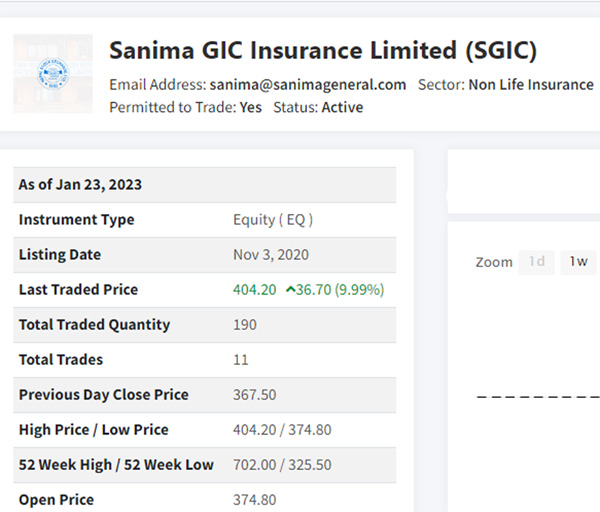 कारोबार आएको पहिलो दिनमै कम्पनीको शेयरमा सर्किट लागेको हो । कम्पनीको शेयरले ३७४ रुपैयाँ ८० पैसा ओपनिङ्ग रेञ्ज पाएको छ । यो समाचार तयार पार्दासम्म सानिमा जिआइसीको शेयरमूल्य ९.९९ प्रतिशत अर्थात् ३६ रुपैयाँ ७० पैसाले बढेर शेयरमूल्य ४०४ रुपैयाँ २० पैसा पुगेको छ ।