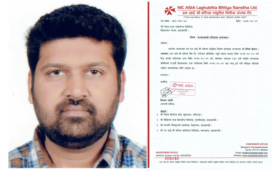 एनआइसी एशिया लघुवित्तका सञ्चालक दिपेश खेतानद्वारा राजीनामा