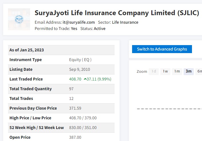कम्पनीको शेयरले पहिलो कारोबारका लागि ३८७ रुपैयाँ ओपनिङ्ग प्राइस पाएको छ । शेयरबजार खुलेको केही समयमा नै कम्पनीको शेयरमा सकारात्मक सर्किट लागेको छ । सूर्यज्योति लाइफको शेयरले ९.९९ प्रतिशत अर्थात ३७ रुपैयाँ ११ पैसाले बढेर शेयरमूल्य ४०८ रुपैयाँ ७० पैसा पुगेको छ ।