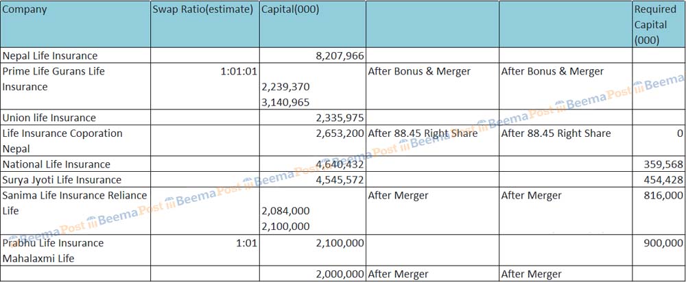 यता, एक आपसमा मर्जर सहमति गरेका प्रभु लाइफ र महालक्ष्मी लाइफको पनि चुक्ता पुँजी ५ अर्ब पुर्याउन ९० करोड रुपैयाँ थप गर्नुपर्ने देखिन्छ ।महालक्ष्मी लाइफले अहिलेसम्म सार्वजनिक सेयर निष्कासन (आइपीओ) गरेको छैन । त्यस्तै, सानिमा र रिलायन्स लाइफको पनि मर्जरपश्चात पनि पुँजि ५ अर्ब पुग्ने देखिँदैन ।