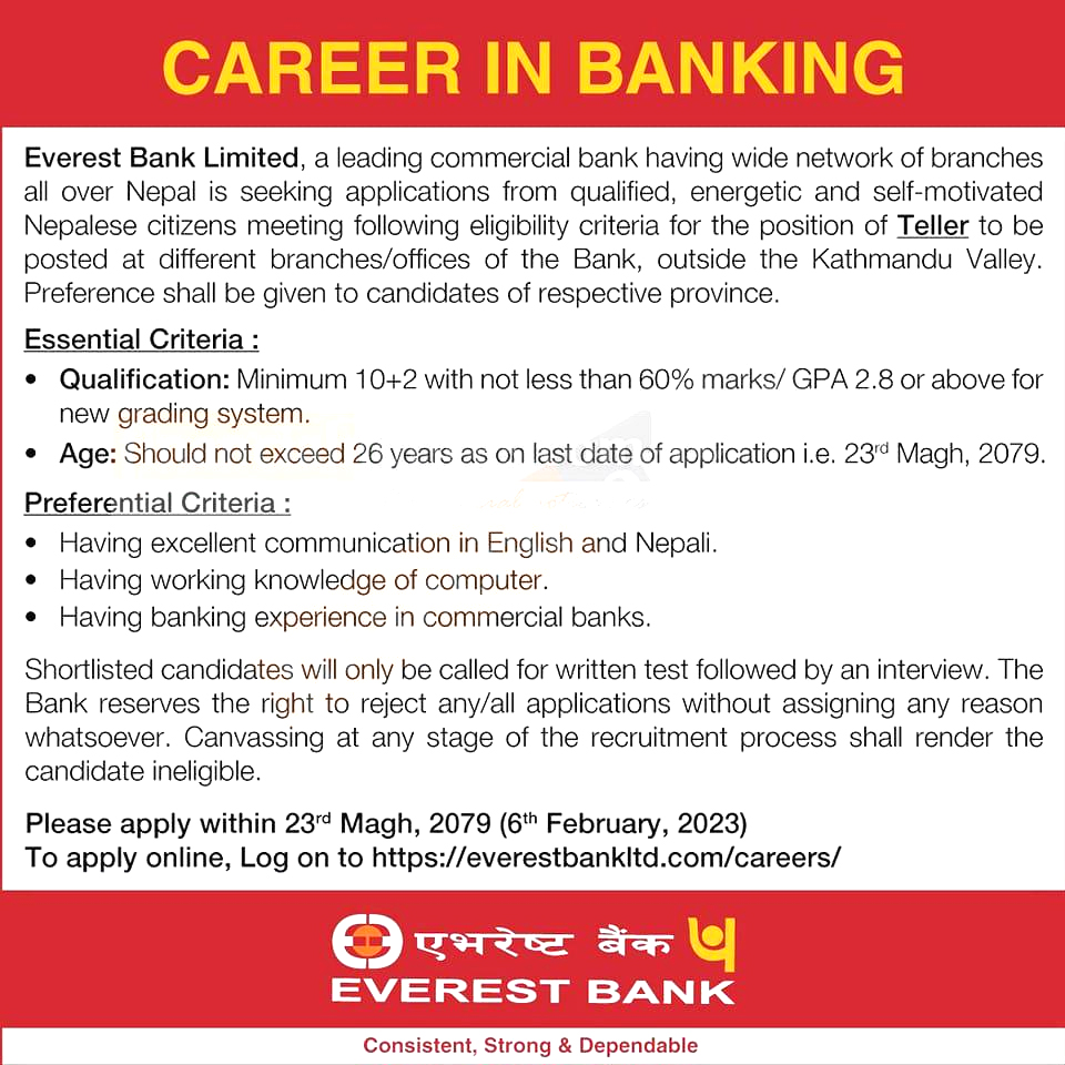 इच्छुक उम्मेदवारले माघ २३ गतेसम्म बैंकको वेवसाईट https://everestbankltd.com/ मार्फत आवेदन दिन सक्नेछन् ।