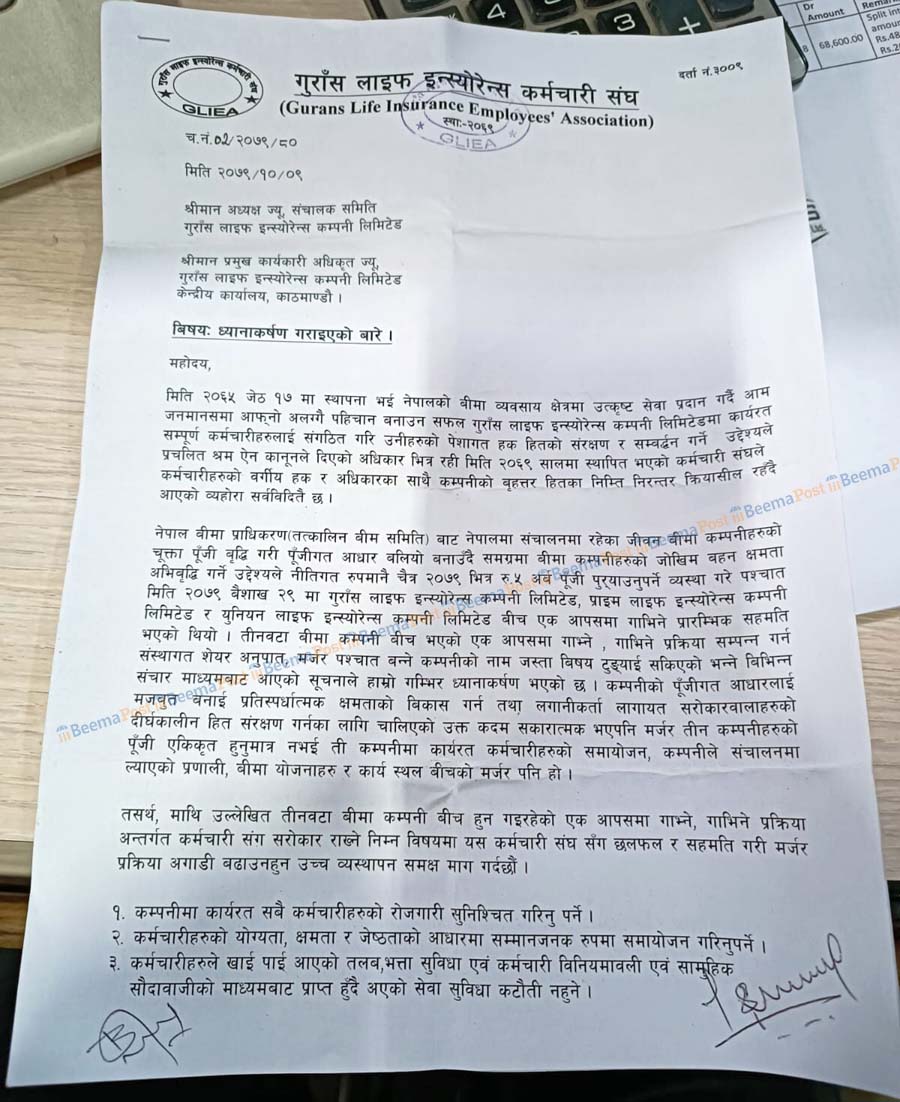 तीन कम्पनीबीच भएको मर्जर सम्झौतालाई लिएर गुराँस लाइफ इन्स्योरेन्स कर्मचारी संघले कर्मचारीहरुको योग्यता, दक्षता र जेष्ठताको सम्मानजनक रुपमा समायोजन हुनुपर्ने लगायत ६ बुँदे माग समेत राखेका छन् ।