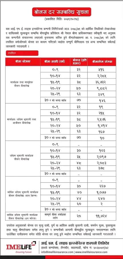 सावधिक तथा सामूहिक जीवन बीमालेख अन्तर्गत बीमालेखमा कम्पनीले नौ वर्ष अवधिसम्मको लागि प्रतिहजार ३२ रुपैयाँ बोनसदर घोषणा गरेको छ ।