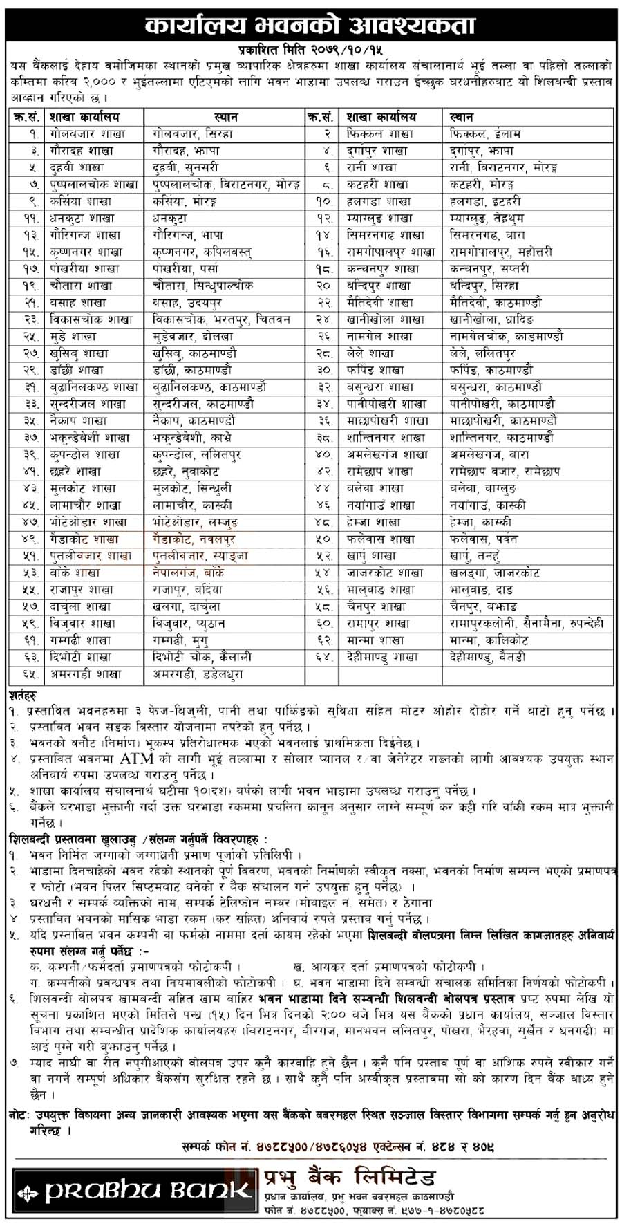 इच्छुक धरधनीहरुले १५ दिनभित्र बैंकको प्रधान कार्यालय संजाल विस्तार विभा तथा सम्बन्धित प्रादेशिक कार्यालयहरु विराटनगर, बीरगंज, मानभवन, ललितपुर, पोखरा भैरहवा, सुर्खेत र धनगढीमा शिलबन्दी प्रस्ताव पेश गर्न सक्नेछन् ।