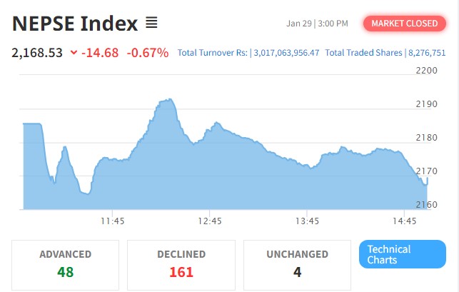 काठमाडौं । साताको पहिलो दिन शेयरबजारमा दोहोरो अंकको गिरावट आएको छ । नेप्से सूचक १४.६८ अंकले घटेर २१६८ को विन्दुमा कायम भएको छ ।