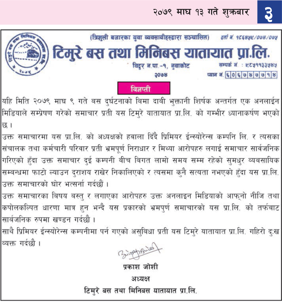 टिमुरे बस तथा मिनिबस यातायात प्रा.लि. का अध्यक्ष प्रकाश जोशीले हस्ताक्षर गरेको बिज्ञप्तिमा भनिएको छ, यही मिति २०७९ माघ ९ गते बस दुर्घटनाको बीमा दावी भुक्तानी शिर्षक अन्तर्गत एक अनलाईन मिडियाले सम्प्रेषण गरेको समाचार प्रति यस टिमुरे यातायात प्रा.लि.को गम्भिर ध्यानाकषर्ण भएको छ । उक्त समाचारमा यस प्रा.लि. को अध्यक्षको हवाला दिँदै प्रिमियर इन्स्योरेन्स कम्पनी र त्यसका सञ्चालक तथा कर्मचारी परिवारप्रति भ्रमपूर्ण, निराधार र मिथ्या आरोपहरु लगाई समाचार सार्वजनिक गरिएको हुँदा उक्त समाचार दुई कम्पनी बीच विगत लामो समयसम्म रहेको सुमधुर व्यवसायिक सम्बन्धमा फाटो ल्याउन दुराशय राखेर निकालिएको र त्यसमा कुनै सत्यता नभएको हुँदा यस प्रा.लि उक्त समाचारको घोर भत्र्सना गर्दछौं । उक्त समाचारका विषयबस्तु र लगाएका आरोपहरु उक्त अनलाईन मिडियाको आफ्नो निजि तथा कपोकल्पित धारणा मात्र हुन भन्दै यस प्रकारको भ्रमपूर्ण समाचारको यस प्रा.लि.को तर्फबाट सार्वजनिक रुपमा खण्डन गर्दछौं ।’