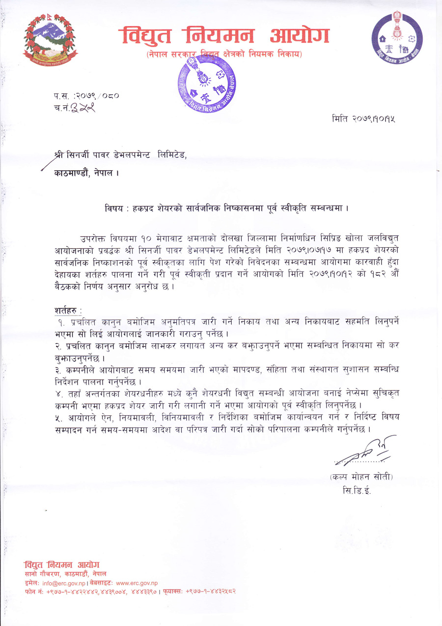 सिनर्जी पावरले ५० प्रतिशत हकप्रद जारी गर्ने, विद्युत नियमन आयोगबाट स्वीकृत