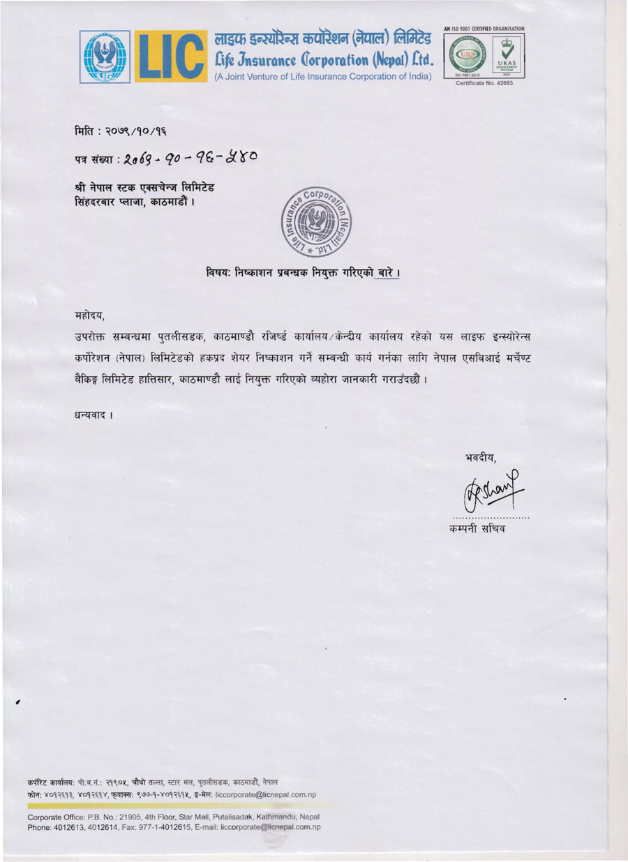 एलआइसी नेपालको हकप्रद निष्काशन प्रक्रिया अघि बढ्यो, बिक्री प्रबन्धकमा नेपाल एसबिआई मर्चेन्ट नियुक्त