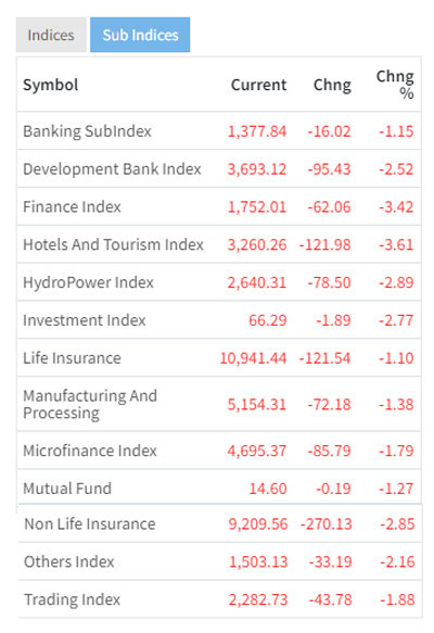 त्यस्तै, नेप्सेमा रहेका १३ उपसूचक नै आज राताम्य भएका छन् । सर्वाधिक होटल तथा पर्यटन सूचकको ३.६१ प्रतिशतले घटेको छ । त्यस्तै, वित्त सूचकको पनि ३.४२ प्रतिशतले घट्न पुगेको छ ।
