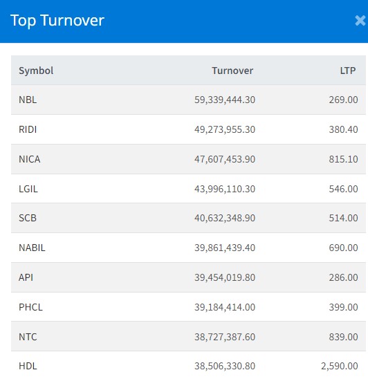 त्यस्तै, रिडी हाइड्रोपावरको ४ करोड ९२ लाख, एनआइसी एशिया बैंकको ४ करोड ७६ लाख, लुम्बिनी जनरल इन्स्योरेन्सको ४ करोड ३९ लाख र स्ट्याण्डर्ड चार्टर्ड बैंकको ४ करोड ६ लाख रुपैयाामाथिको कारोबार भएको छ ।
