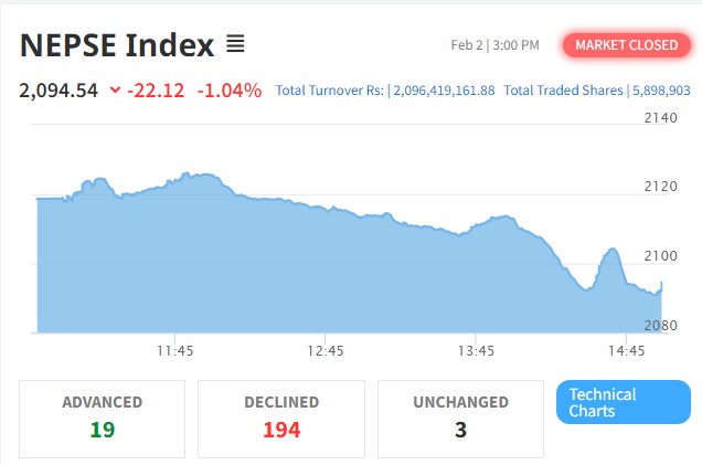 नेप्से सूचक आज २२.१२ अंकले घटेर २०९४ विन्दुमा कायम भएको छ । नेप्सेमा सूचीकृत २५७ कम्पनीको ५८ लाख ९८ हजार ९०३ कित्ता शेयर किनबेच हुँदा २ अर्ब ९ करोड ६४ लाख रुपैयाँमाथिको कारोबार भएको छ ।