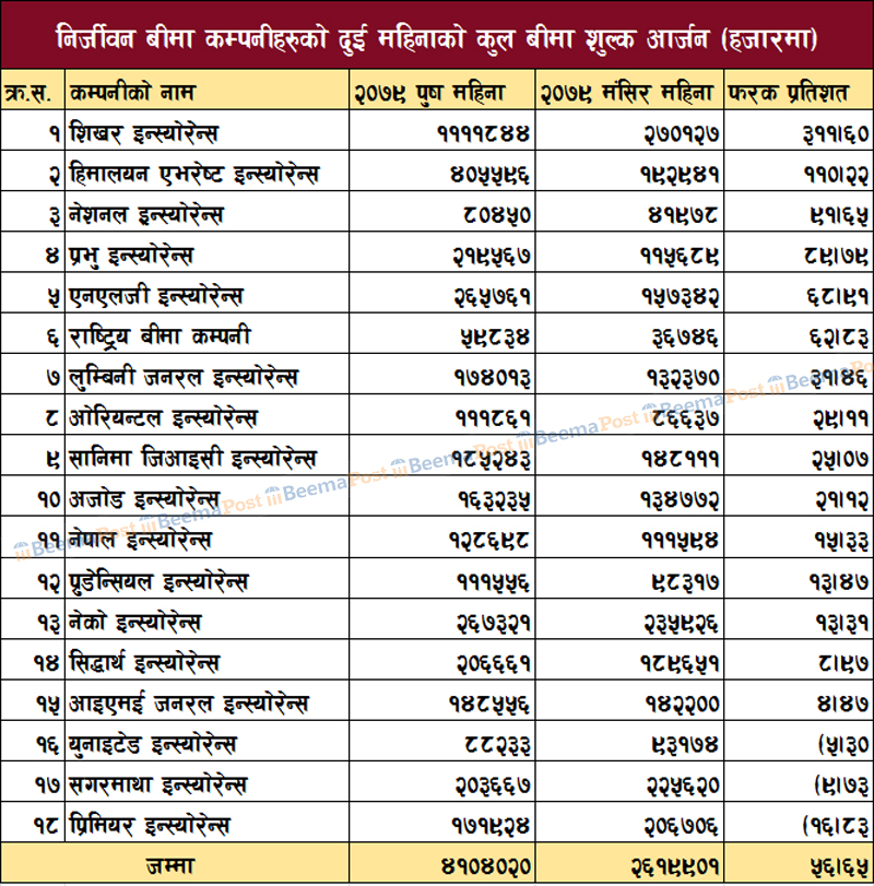 मंसिरको तुलनामा पुष महिनामा ५६ प्रतिशतले बढ्यो निर्जीवन बीमा ब्यवसाय, शिखर र हिमालयन एभरेष्ट सबैभन्दा अगाडी (तथ्याङ्कसहित)