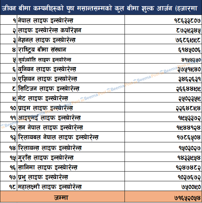 त्यस्तै, राष्ट्रिय बीमा संस्थानले ६ अर्ब १४ करोड, सूर्यज्योतिले ४ अर्ब १५ करोड, युनियनले ३ अर्ब ७५ करोड, एशियन लाइफले ३ अर्ब ४६ करोड, सिटिजन लाइफले २ अर्ब ६६ करोड, मेट लाइफले २ अर्ब ५० करोड, प्राइम लाइफले २ अर्ब २६ करोड, आइएमई लाइफले १ अर्ब ९५ करोड, सन नेपाल लाइफले १ अर्ब ९४ करोड, रिलायबल नेपाल लाइफले १ अर्ब ७८ करोड, रिलायन्स लाइफले १ अर्ब ५० करोड, गुराँस लाइफले १ अर्ब ४३ करोड, सानिमा लाइफले १ अर्ब २४ करोड, प्रभु लाइफले १ अर्ब ३ करोड र महालक्ष्मी लाइफले ७५ करोड रुपैयाँ कुल बीमा शुल्क आर्जन गरेको छ ।