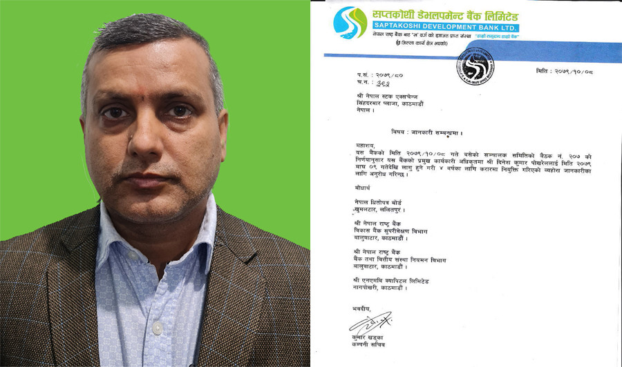 काठमाडौं । सप्तकोशी डेभलपमेन्ट बैंक लिमिटेडको प्रमुख कार्यकारी अधिकृत (सिइओ)मा दिनेश कुमार पोखरेल नियुक्त भएका छन् ।