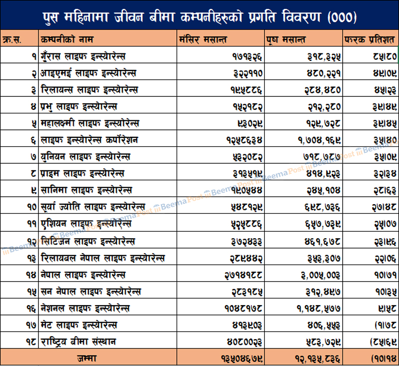 त्यस्तै, प्रभु लाइफले ३९.४९ प्रतिशत, महालक्ष्मी लाइफले ३९.४५ प्रतिशत, एलआइसी नेपालले ३५.४० प्रतिशत, युनियन लाइफले ३५.०९ प्रतिशत, प्राइम लाइफले ३२.३४ प्रतिशत, सानिमा लाइफले २८.३६ प्रतिशत, सूर्यज्योति लाइफले २७.४८ प्रतिशत, एशियन लाइफले २५.०७ प्रतिशत, सिटिजन लाइफले २३.९६ प्रतिशत, रिलायबल नेपाल लाइफले २२.०६ प्रतिशत, नेपाल लाइफले १०.७१ प्रतिशत, सन नेपाल लाइफले १०.३५ प्रतिशत र नेशनल लाइफले ९.५८ प्रतिशतले बीमा ब्यवसाय बढाएका छन् । त्यस्तै, मंसिर महिनाको तुलनामा पुष महिनामा दुई जीवन बीमा कम्पनीको ब्यवसाय भने घटेको छ । जसमा मेट लाइफको १.७८ प्रतिशत र राष्ट्रिय बीमा संस्थानको ८५.६५ प्रतिशतले घटेको छ ।