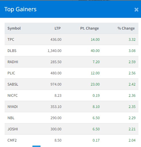 आज नेप्से सूचक सामान्य अंकले घटेपनि केही कम्पनीहरुको शेयरमूल्य बढ्न पुगेको छ । आज सबैभन्दा बढी तेह्रथु पावरको शेयरमूल्य ३.३२ प्रतिशतले बढेको छ ।