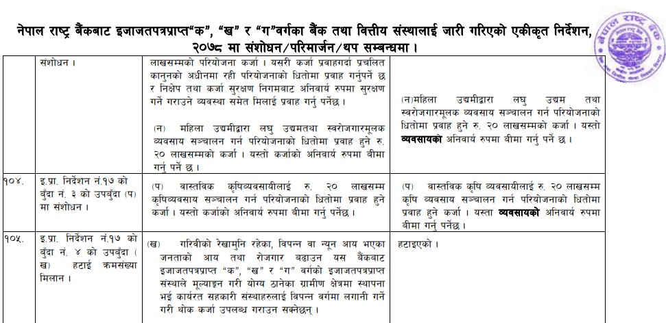 नयाँ व्यवस्था अनुसार २० लाख रुपैयाँसम्म कृषि व्यवसायीलाई दिँदै आएको ऋण सम्बन्धी व्यवस्थालाई यथावत राखिएको छ । देश आर्थिक संकटबाट अझै पार नलागिसकेको अवस्थामा आम सर्वसाधरण जनता स साना ऋण उद्यम तथा पेशा व्यवसाय गर्ने इच्छा प्रकट गर्नेहरुमाथि राष्ट्र बैंकले किन प्रहार गर्यो रु गम्भिर प्रश्न उठेको छ । निर्देशिका परिमार्जन गर्दै केन्द्रीय बैंकले गरिब जनता र महिलालाई वित्तीय क्षेत्रमा पहुँच झनै कडा बनाएको आज प्रकाशित संशोधित एकीकृत निर्देशिकामा देखिएको छ ।