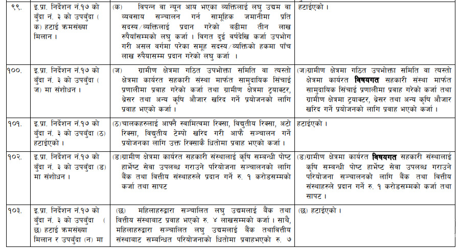 साथै एकीकृत निर्देशनममा महिलालाई दिइदै आएको चार लाख रुपैयाँसम्म र सात लाख रुपैयाँसम्मका परियोजना धितो कर्जा सम्बन्धी व्यवस्था खारेज गरिएको छ ।