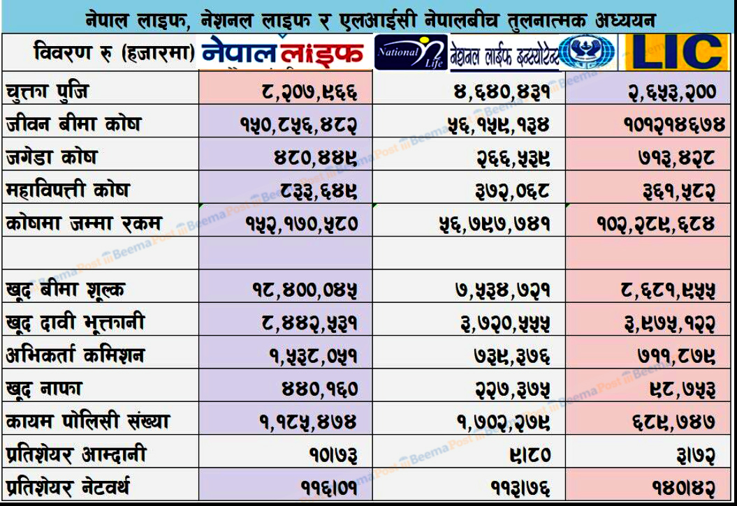 बीमापोष्टले नेपाल लाइफ इन्स्योरेन्स, नेशनल लाइफ इन्स्योरेन्स र लाइफ इन्स्योरेन्स कर्पोरेशन नेपाल कम्पनीबीच गरेका तुलनात्मक अध्ययन यस्तो छः