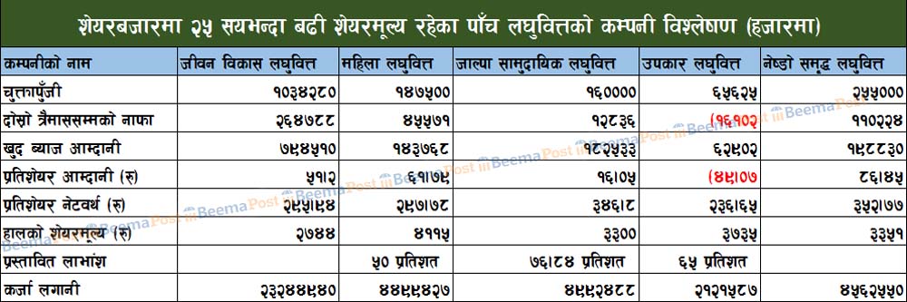 जीवन विकास लघुवित्त, महिला लुघवित्त, जाल्पा सामुदायिक लघुवित्त, उपकार लुघवित्त र नेष्डो समृद्ध लघुवित्तको वित्तीय विवरणका अनुसार यी संस्थाहरुले दोस्रो त्रैमाससम्म कति नाफा आर्जन गरे, इपीएस कति छ साथै खुद ब्याज आम्दानी कति गरे भन्ने जस्ता सूचाङ्कहरु तयार पारेको छ ।