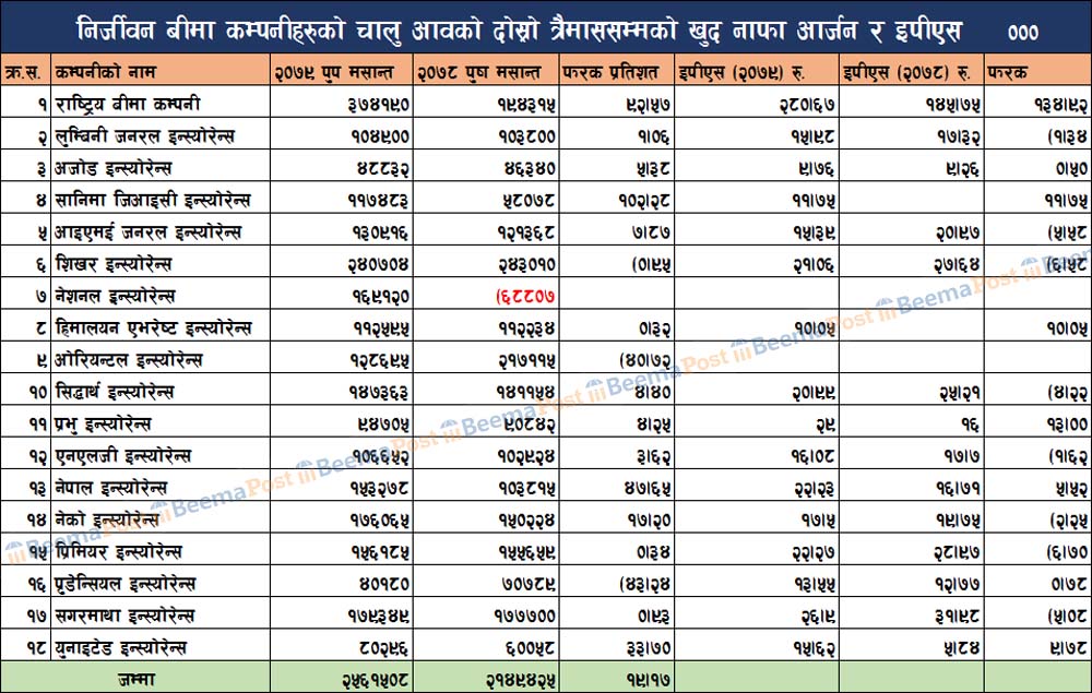 १८ निर्जीवन बीमा कम्पनीमध्ये यस अवधिसम्ममा सबैभन्दा बढी प्रतिशेयर आम्दानी (इपीएस) भएको संस्थामा सरकारी स्वामित्वको राष्ट्रिय बीमा कम्पनी रहेको छ । कम्पनीको इपीएस २८० रुपैयाँ ६७ पैसा रहेको छ । गत आवको तुलनामा कम्पनीको इपीएस १३४ रुपैयाँ ९२ पैसा बढेको हो ।