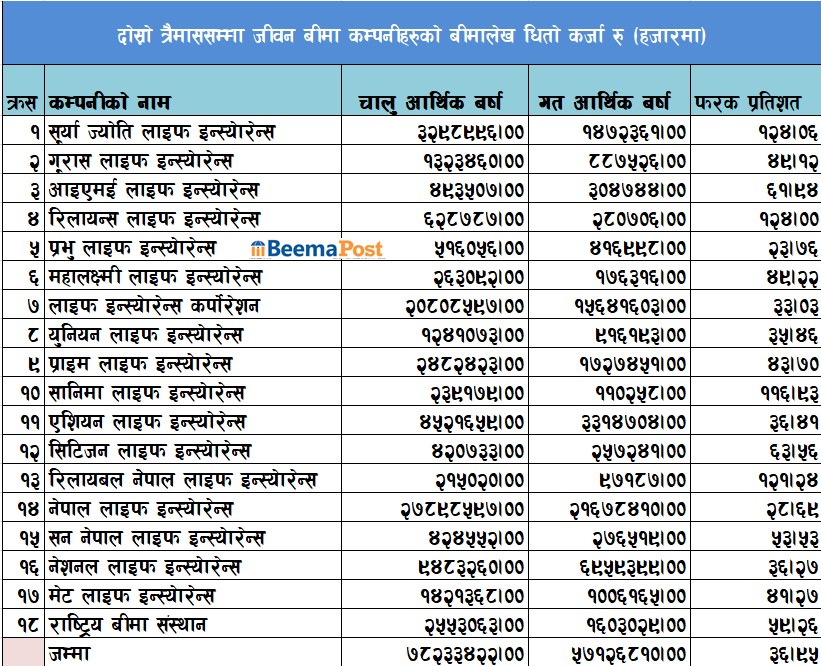 जस कारणले गर्दा बीमालेख धितो राखी कर्जा लिने बीमितको आकर्षण बढ्दै गएको देखिन्छ । तर बीमितले सिमित अवधिमा मात्रै बीमालेख धितोमा साक्षी राखी ऋण लिन पाउनेछन् ।कम्पनीहरुले प्रकाशन गरेको वित्तिय विवरण अनुसार दोस्रो त्रैमाससम्ममा बृद्धिदरको आधारमा सूर्या ज्योती लाइफ इन्स्योरेन्स कम्पनी रहेको छ ।