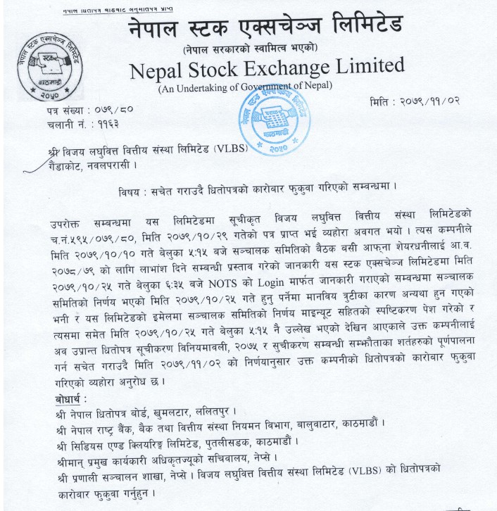 सेयर कारोबार रोक्का गर्दै नेप्सेले ३ दिनभित्रमा स्पष्टीकरण पेश गर्नसमेत कम्पनीलाई निर्देशन दिएको थियो । विजय लघुवित्तले स्पष्टीकरण पेश गरेपछि सचेत गराउँदै सेयर कारोबार फुकुवा गरिएको नेप्सेले जानकारी गराएको छ ।