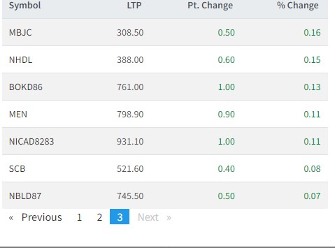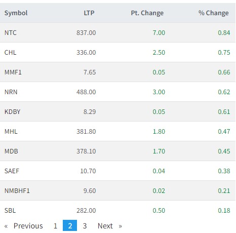 सानिमा लार्ज क्याप फण्ड, राप्ती हाईड्रो एण्ड कन्स्ट्रक, प्रभु सेलेक्ट फण्ड, सबैको लघुवित्त, इमजिङ नेपाल, सिटिजन म्युचुअल फण्ड २, एनआइबिएफ समृद्धि फण्ड, श्वेत गंगा, उपकार लघुवित्त र नेपाल इन्भेष्टमेन्ट बैंकिङको शेयर उकालो लागेको छ।