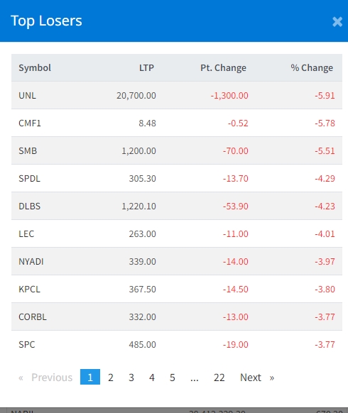 शेयर बजार घटेसंगै युनिलिभर नेपाल लिमिटेड, सिटिजन म्युचुअल फण्ड, सपोर्ट माइक्रोफाइनान्स, सिनर्जी पावर डेभलपमेन्ट लगायत अन्य कम्पनीको शेयर मुल्य घटेको छ ।