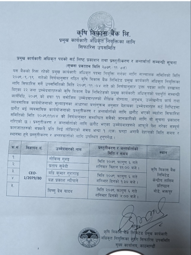 कृषि विकास बैंकको सिईओ नियुक्तीका लागि पाँच जनाको सर्टलिष्ट छनौट, आईतबार अन्तर्वार्ता