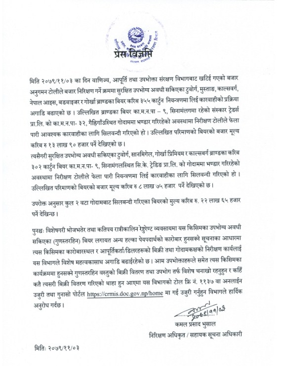 आपूर्ति तथा उपभोक्ता संरक्षण विभागका अनुसार बजार अनुगमनको क्रममा यही फागुन ३ गते सुरक्षित उपभोग्य अवधी सकिएर उपभोग गर्नै नहुने अवस्थाका टुबोर्ग, मुस्ताङ, काल्सबर्ग, नेपाल आइस, बडवाईजर र गोर्खा ब्राण्डका ३५५ कार्टुन बियर नियन्त्रणमा लिई कारवाही प्रक्रिया अघि बढाइएको छ । उक्त बियर ठूला पार्टी भोजमा लगेर खुवाउने ठाउँमा पठाउन लागिएको बुझिएको छ ।ठूलो होटल तथा भोजहरुमा उपभोक्ताले थाहा नपाउने गरी बिक्री वितरण गर्ने गरिएको तथ्य समेत उक्त घटनाले उजागर भएको छ ।