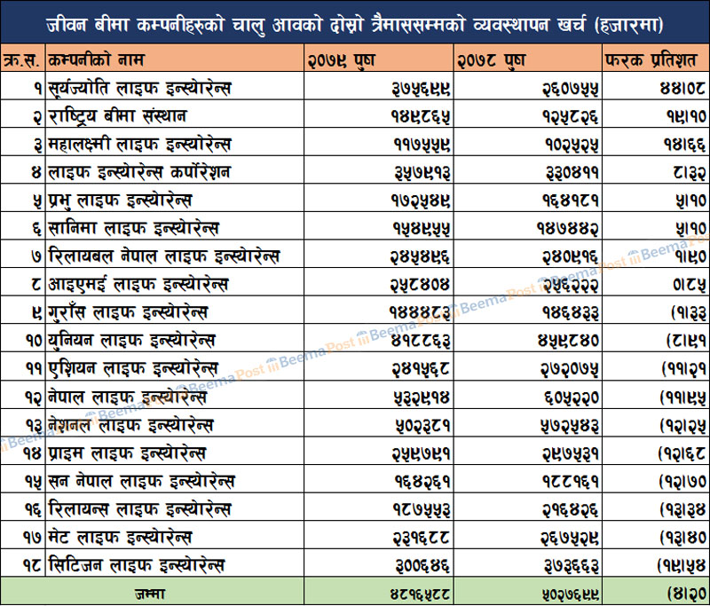 गत आर्थिक वर्षको यसै अवधिसम्म कम्पनीहरुले ५ अर्ब २ करोड ७६ लाख रुपैयाँ व्यवस्थापनमा खर्चिएका थिए । एक वर्षको तुलनामा कम्पनीहरुको व्यवस्थापन खर्च घट्न पुगेको हो । नेपाल बीमा प्राधिकरणको निर्देशनबमोजिम जीवन बीमा कम्पनीहरुले एक आपसमा गाभ्ने।गाभिने वा मर्जरमा जाने सम्झौता गरेतापनि केही कम्पनीबाहेक अधिकांश कम्पनीको व्यवस्थापन खर्च घटेको वित्तीय रिर्पोटले देखाएको छ ।