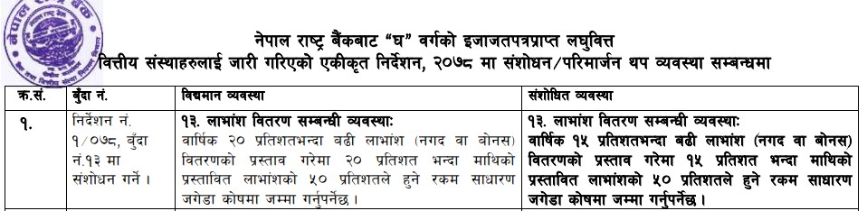 अब वार्षिक १५ प्रतिशतभन्दा बढी लाभांश (नगद वा बोनस) वितरणको प्रस्ताव गरेमा १५ प्रतिशत भन्दा माथिको प्रस्तावित लाभांशको ५० प्रतिशतले हुने रकम साधारण जगेडा कोषमा जम्मा गर्नुपर्ने राष्ट्र बैंकले जनाएको छ ।