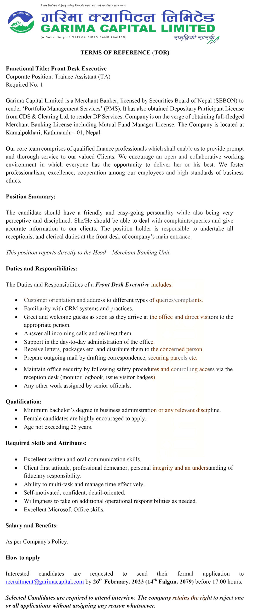 गरिमा क्यापिटलद्धारा कर्मचारी माग, कति चाहिन्छ शैक्षिक योग्यता ?