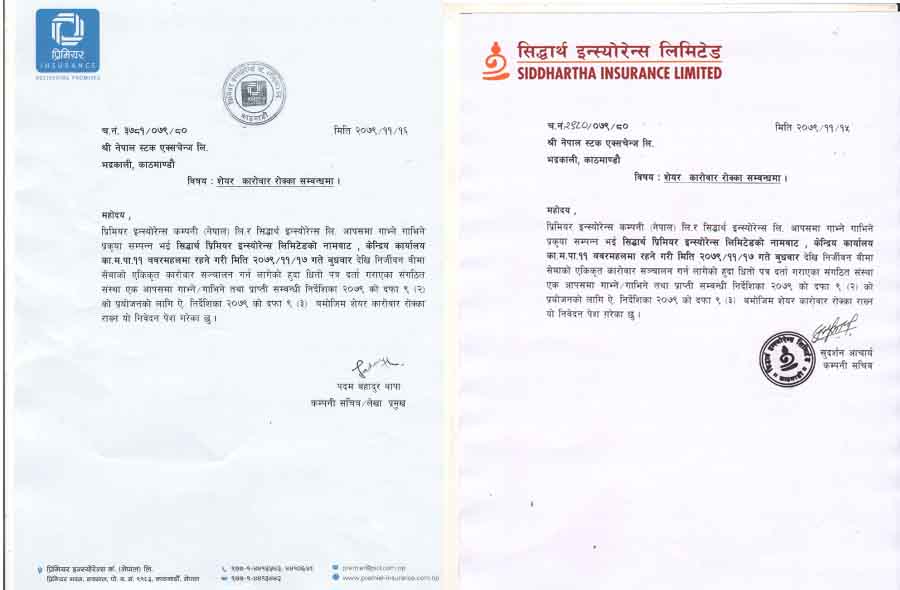 प्रिमियर इन्स्योरेन्स कम्पनी (नेपाल) लिमिटेड र सिद्धार्थ इन्स्योरेन्स लिमिटेड एक आपसमा गाभ्ने गाभिने प्रक्रिया सम्पन्न भई सिद्धार्थ प्रिमियर इन्स्योरेन्स लिमिटेडको नामबाट केन्द्रीइ कार्यालय काठमाडौं महानगरपालिका वडा नंं ११ बबरमहलमा रहने गरी फागुन १७ गते बुधबारदेखि निर्जीवन बीमा सेवाको एकीकृत कारोबार संचालन गर्न लागेको हुँदा धितोपत्र दर्ता गराएका संगठित संस्था एक आपसमा गाभ्ने।गाभिने तथा प्राप्ति सम्बन्धी निर्देशिकाको प्रयोजनका लागि ऐ. निर्देशिका बमोजिम शेयर कारोबार रोक्का हुने भएको हो ।