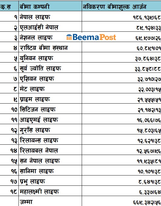 माघ मसान्तसम्ममा नेपाल लाइफ अग्रस्थान रह्न सफल भएको छ। कम्पनीले यस अवधिसम्ममा १८ अर्ब रुपैयाँ नविकरण बीमाशुल्क आर्जन गर्न सफल भएका छन् ।दोसोमा एलआईसी नेपाल रहेको छ । कम्पनीले यस अवधिसम्ममा ८ अर्ब ९१ करोड रुपैयाँ नविकरणमा बीमाशुल्क आर्जन गर्न सफल भएको छ।