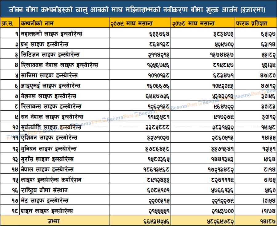 जीवन बीमा कम्पनीहरुको नविकरण बीमा शुल्क आर्जन झण्डै ६७ अर्ब, महालक्ष्मी र प्रभु लाइफको देखियो प्रगति, कुनको अवस्था कस्तो ? (तथ्याङ्कसहित)