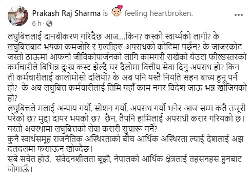 उनले भनेका छन्, ‘लघुबित्तलाई दानबीकरण गरिदैछ आज किन ? कस्को स्वार्थको लागी ? के लघुबित्तबाट भएका कमजोरी र गÞल्तीहरु अपराधको कोटिमा पर्छन ? के जाजरकोट जस्तो ठाऊमा आफनो जीविकोपार्जनको लागि कामगरी राखेको एउटा फील्डस्तरको कर्मचारीले बिभिन्न दुःख कस्ट झेल्दै घर दैलोमा वित्तीय सेवा दिनु अपराध हो ? किन ती कर्मचारीलाई कालोमोसो दलियों ? के अब पनि यस्तै नियति सहन बाध्य हुनू पर्ने हो ? के अब लघुबित्त कर्मचारीलाई तिमि यहाँ काम नगर विदेश जाऊ भन्न खोजिएको हो ? लघुबित्तले मलाई अन्याय गर्यो, सोशण गर्यो, अपराध गर्यो भनेर आज सम्म कतै उजूरी परेको छ ? मुद्दा दायर भयको छ ? छैन, तैपनि हामिलाई अपराधी करार गरिएको छ । यस्तो अवस्थामा लघुबित्तको सेवा कसरी सुचारू गर्ने ? कुनै स्वार्थसमूहले राजनैतिक अस्थिरताको बीच आर्थिक अस्थिरता ल्याई देशलाई अझ दलदलमा फसाऊन खोज्दैछ । सबै सचेत होउं, संवेदनशीलता बूझौ, नेपालको आर्थिक क्षेत्रलाई तहसनहस हुनबाट जोगाउ ।’