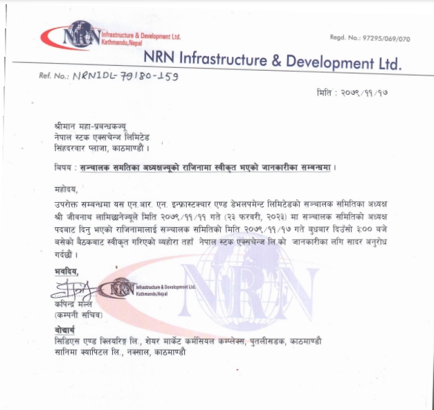 काठमाडौं । एनआरएन इन्फ्रास्टक्चर एण्ड डेभलपमेन्ट लिमिटेडका संचालक समितिका अध्यक्ष जीवनाथ लामिछानेको राजिनामा स्वीकृत गरेको छ ।