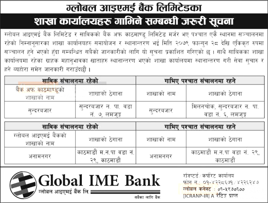 साथै ग्लोबल आइएमई बैंकको काठमाडौ्रं महानगरपालिका वडा नं. २९ काठमाडौंमा रहेको अनामनगर शाखा कार्यालय गाभिएपश्चात् काठमाडौं महानगरपालिका वडा नं. २९ काठमााडौंमा रहनेछ ।